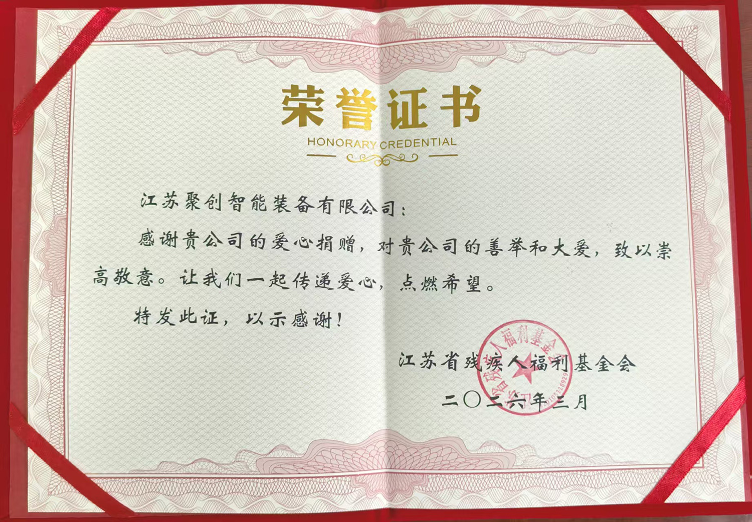 爱心无止境,助残见真情。江苏聚创智能装备有限公司此次获得荣誉证书,不仅为企业自身树立了良好的社会形象,也为更多企业投身公益事业提供了示范与引领。未来,公司将继续以科技创新服务社会,以公益爱心温暖人心,在实现企业高质量发展的同时,持续为江苏省残疾人福利事业添砖加瓦,让扶残助残的大爱洒满人间。